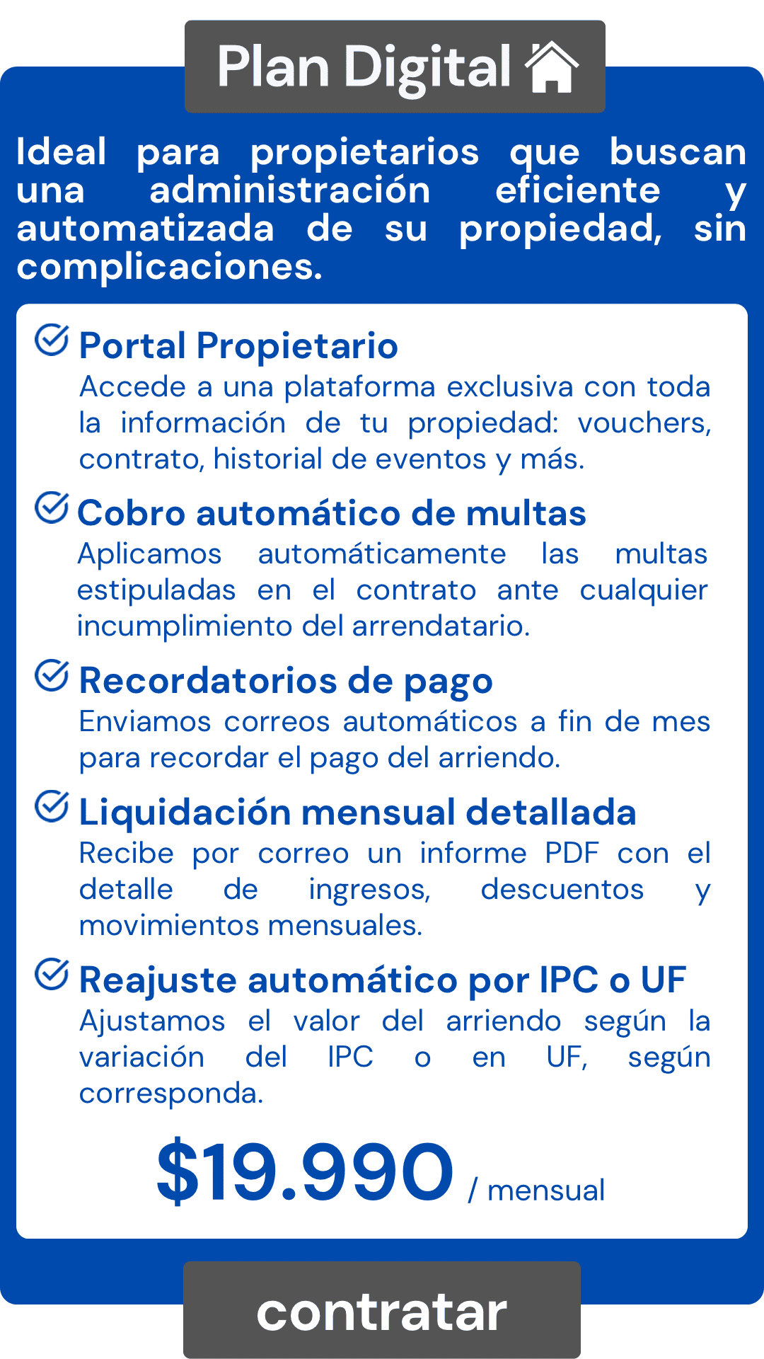 Gestionamos pagos, contratos, mantención, comunicación y cualquier incidente. Tu sólo recibes tu renta puntualmente.